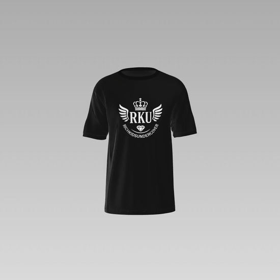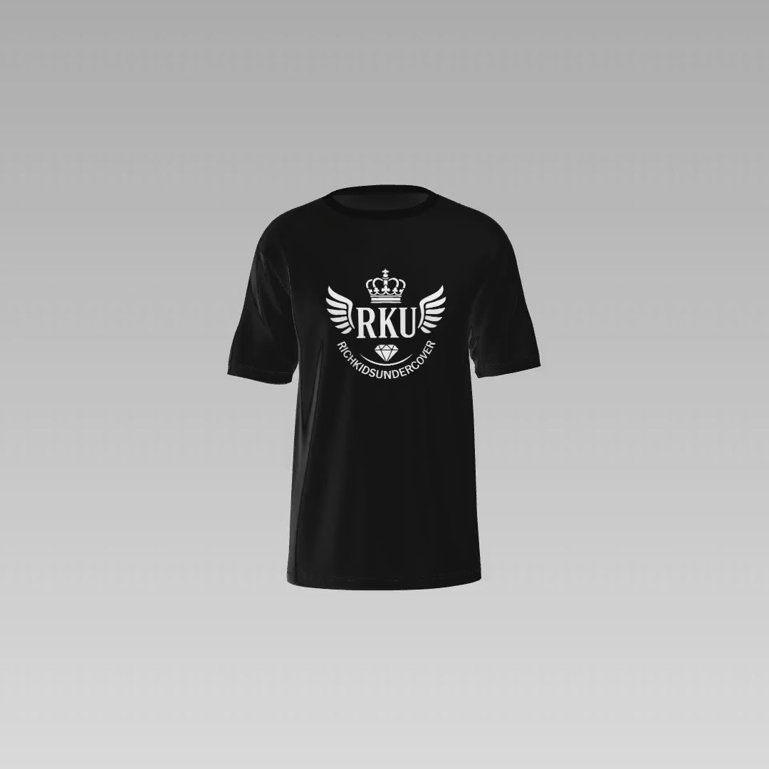 Dieses schwarze T-Shirt aus hochwertiger Baumwolle ist mit unserem auffälligen RKU-Logo (Krone, Flügel und Diamant) bedruckt und bringt dein Streetwear-Game auf das nächste Level. Durch den geraden Schnitt und das weiche Material trägt es sich angenehm bei jedem Anlass. Der hochwertige Druck ist langlebig und behält auch nach vielen Wäschen seine Farbintensität. Kombiniere es lässig zu Jeans oder sportlich zu Shorts – dieses Shirt ist vielseitig und ein absolutes Must-Have für alle, die Undercover-Luxus lieben.